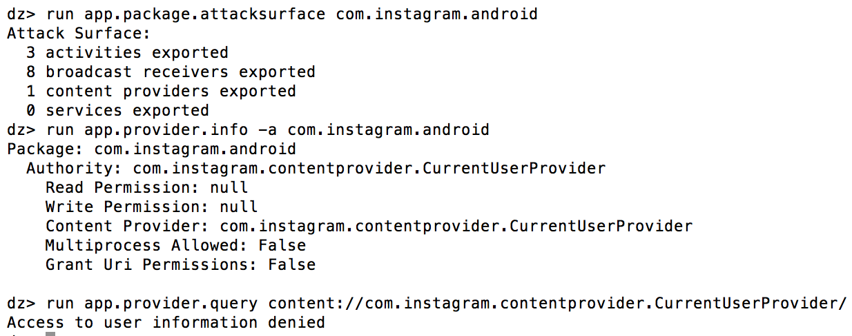 This could be used by an attacker to discover the real identity of the user of the device he/she has infected. This JSONP waterhole attack from 2015 had a similar purpose. Note that Instagram also contains a Content Provider to query the USERID of the registered account (com.instagram.contentprovider.CurrentUserProvider), but is prohibited to query for other apps by default as tested through Drozer: